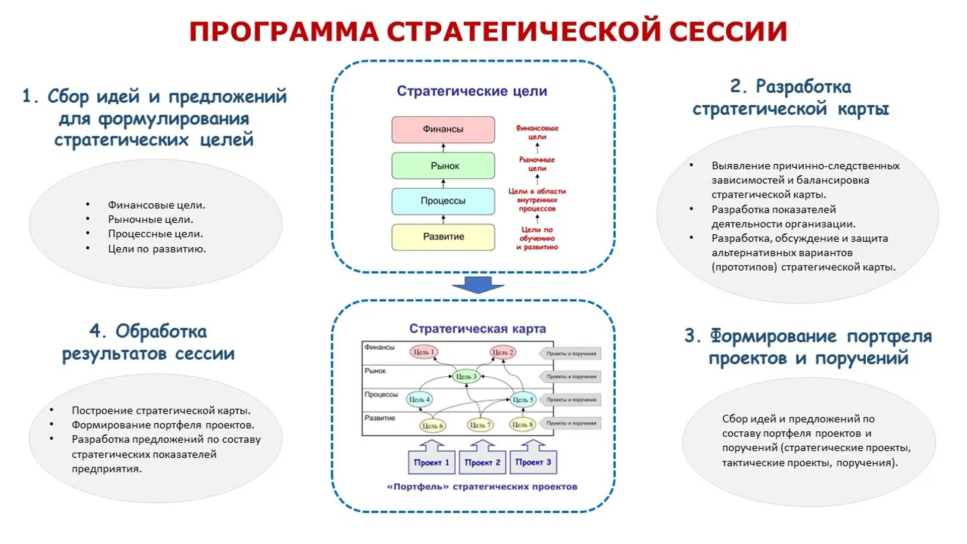 Главная цель стратегической сессии — разработать эффективную стратегию развития компании или проекта, выбрать методы решения возникших проблем. Создать дорожную карту бизнес-событий.